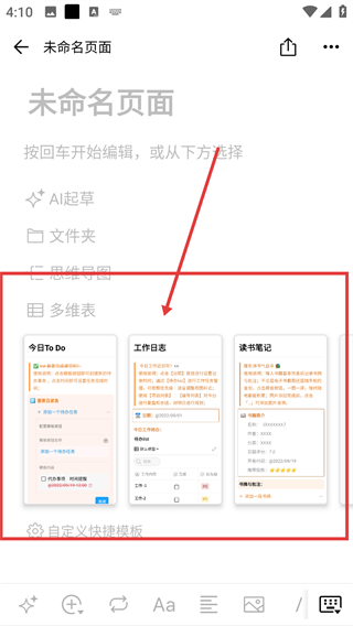 2、进入未命名页面后,能看到【今日ToDo】【工作日志】等模板,选对应的就能快速创建内容哦。