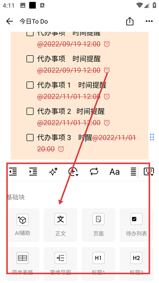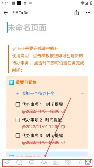 3、进入今日ToDo页面后,点底部功能栏,能展开更多编辑工具,方便对待办内容进行调整啦。