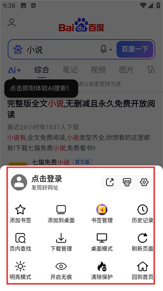 2、在搜索框输入【小说】,再点右侧【搜索】按钮,就能获取相关的搜索结果,找到小说资源哦。
