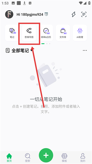 1、在首页,点【思维导图】选项,可进入思维导图编辑页面,开始创建结构化笔记内容哦。