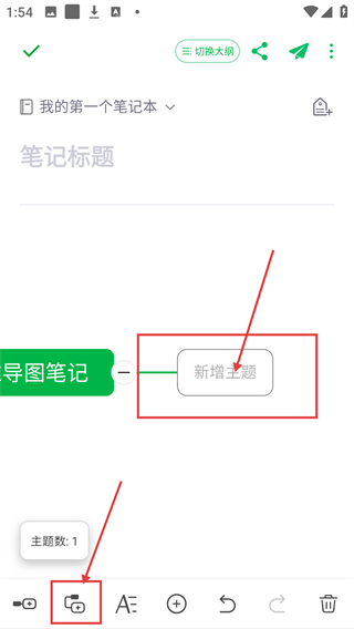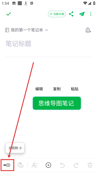 2、进入思维导图编辑页后,点左下角的主题按钮,能添加新的主题节点,搭建笔记的结构啦。