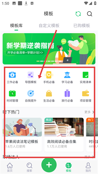 1、选择模板功能:官方模板库已经嵌入到笔记编辑器中,可以在模板库中选择一个模板,使用起来非常方便,只需创建一个新的笔记。