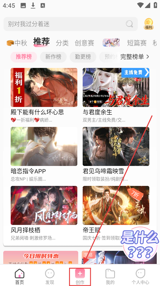 1、在首页,若想进行创作,点击底部的【创作】选项,就能进入创作页面啦。