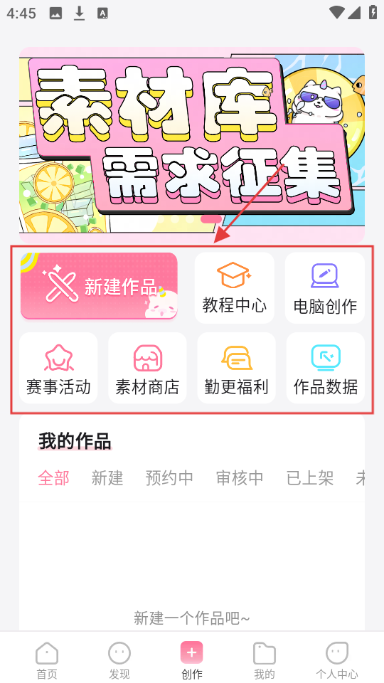 2、进入创作页面后,能看到【新建作品】【教程中心】等功能入口,根据需求使用就行啦。