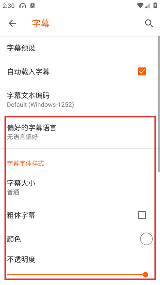 4、【VLC】字幕设置界面,在红框区域调整【偏好的字幕语言】【字幕字体样式】等参数。