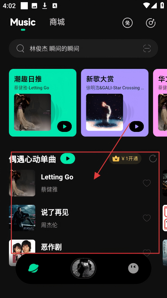 1、在音乐页面,找到【偶遇心动单曲】板块,里面有【Letting-Go】等好听歌曲,快去瞧瞧吧。