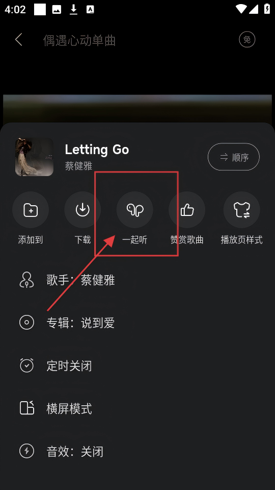 3、在更多操作里,有【一起听】功能,点击它,就可以邀请好友一起听这首歌啦。