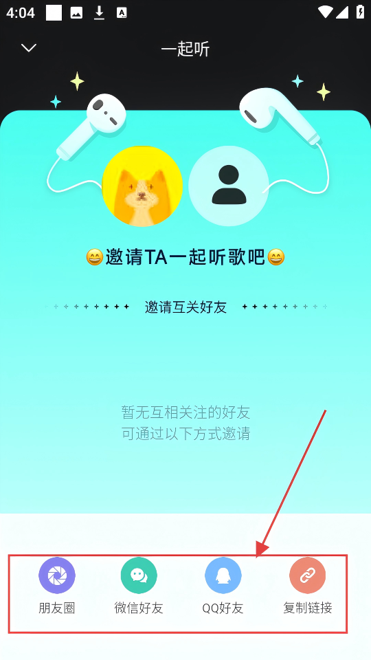 4、进入【一起听】页面,能通过朋友圈、微信好友等方式邀请,快叫上好友共享音乐吧。