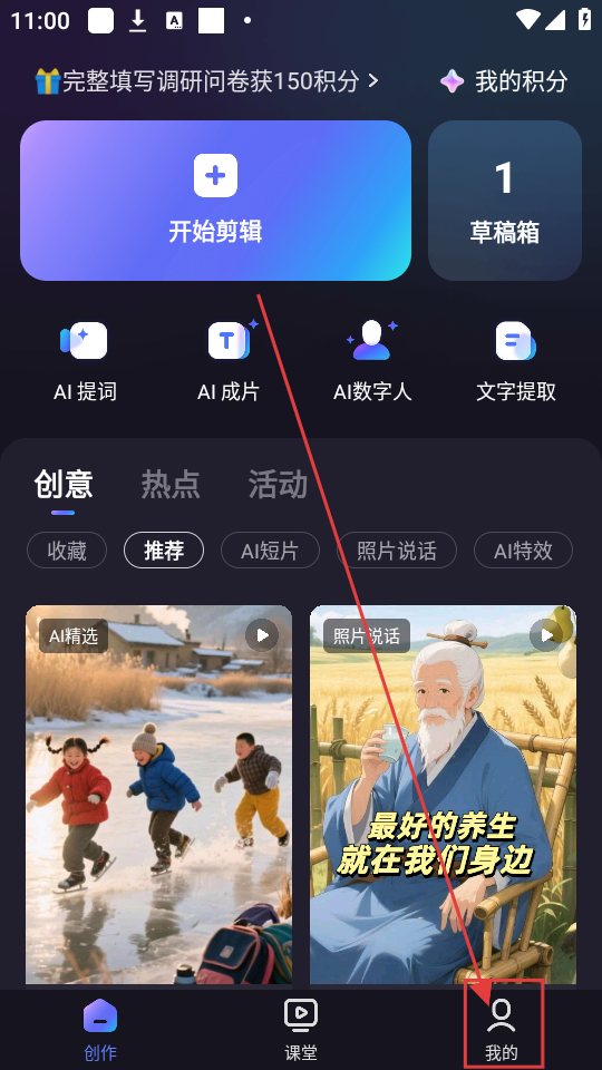 1、在创作页面点击右下角【我的】按钮,进入个人页面可进行登录等操作哦。