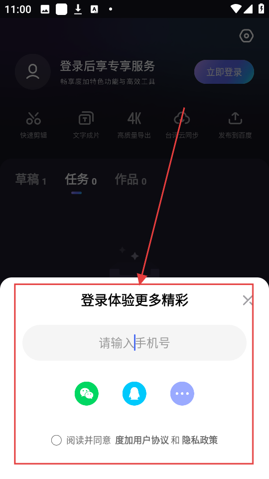 3、在登录界面可输入手机号或选择微信、QQ等方式登录,登录后可体验更多精彩哦。