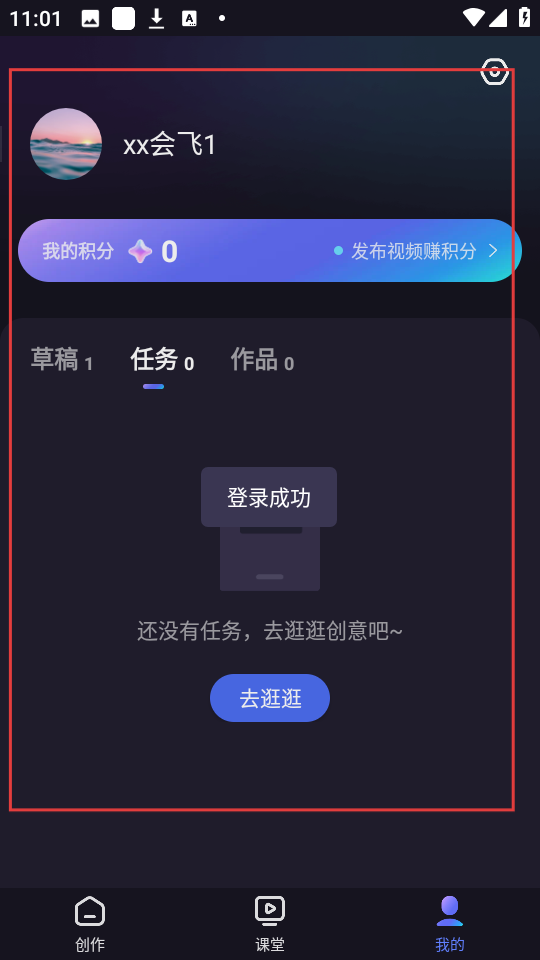 4、登录成功后,个人页面会显示账号信息、积分等内容,还能查看草稿、任务和作品哦。