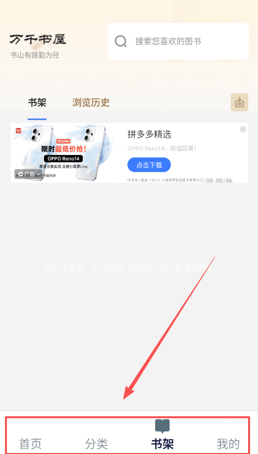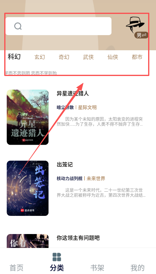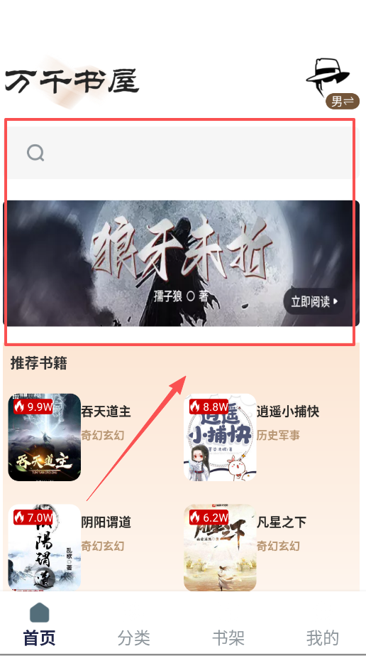 1、首先打开万千书屋app,在底部导航栏选择“分类”按钮,可以看到科幻、玄幻、奇幻等不同类型图书分类。
