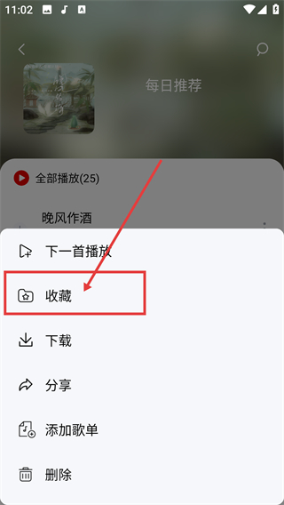 2、在操作菜单里选择【收藏】选项,就能将目标歌曲加入收藏列表,方便之后快速找到哦。