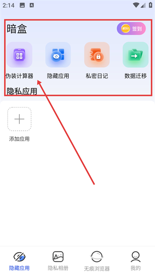 1、在暗盒的隐藏应用页点【伪装计算器】选项,能进入暗盒伪装设置界面,后续可改启动相关内容啦。