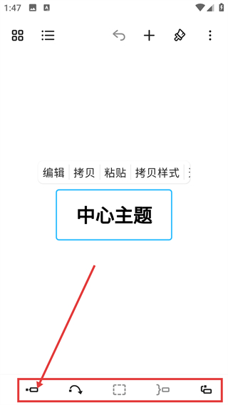 3、进入思维导图编辑页后,能看到默认的【中心主题】,底部工具可辅助调整主题的样式和结构哦。