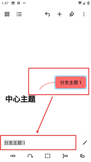 4、添加【分支主题1】后,可在底部输入框编辑主题内容,让思维导图的分支更贴合自己的需求呀。
