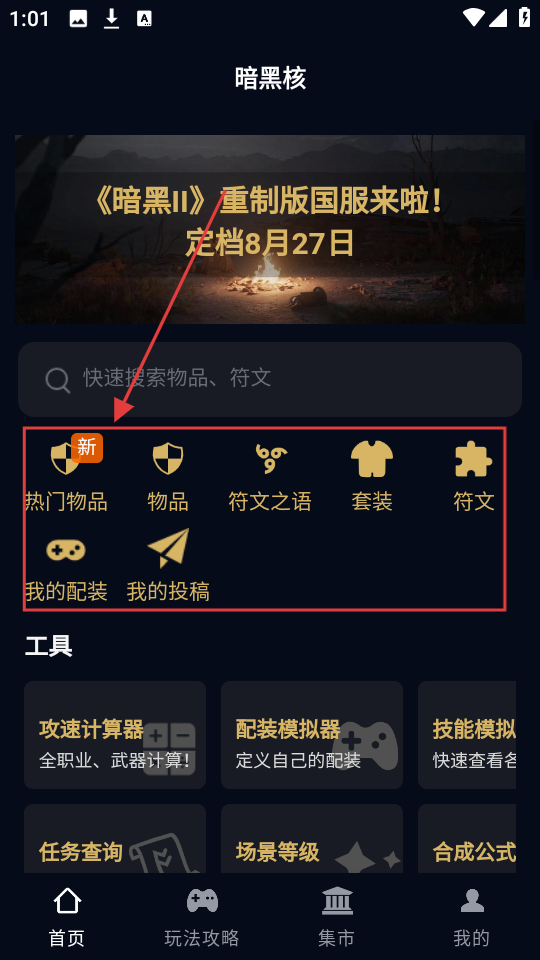 1、在暗黑核首页,有【热门物品】【符文之语】等功能入口,点击就能查看对应内容,超实用的哦。