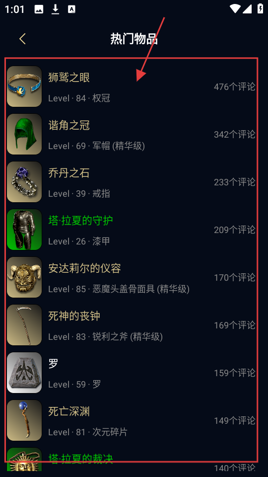 2、进入【热门物品】页面,能看到【狮鹫之眼】【乔丹之石】等热门物品列表,想了解就点进去看呀。