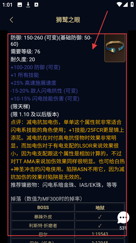 3、点开【狮鹫之眼】,能看到它的防御、技能等属性和点评,还能知道掉落情况,帮你更好搭配装备哦。