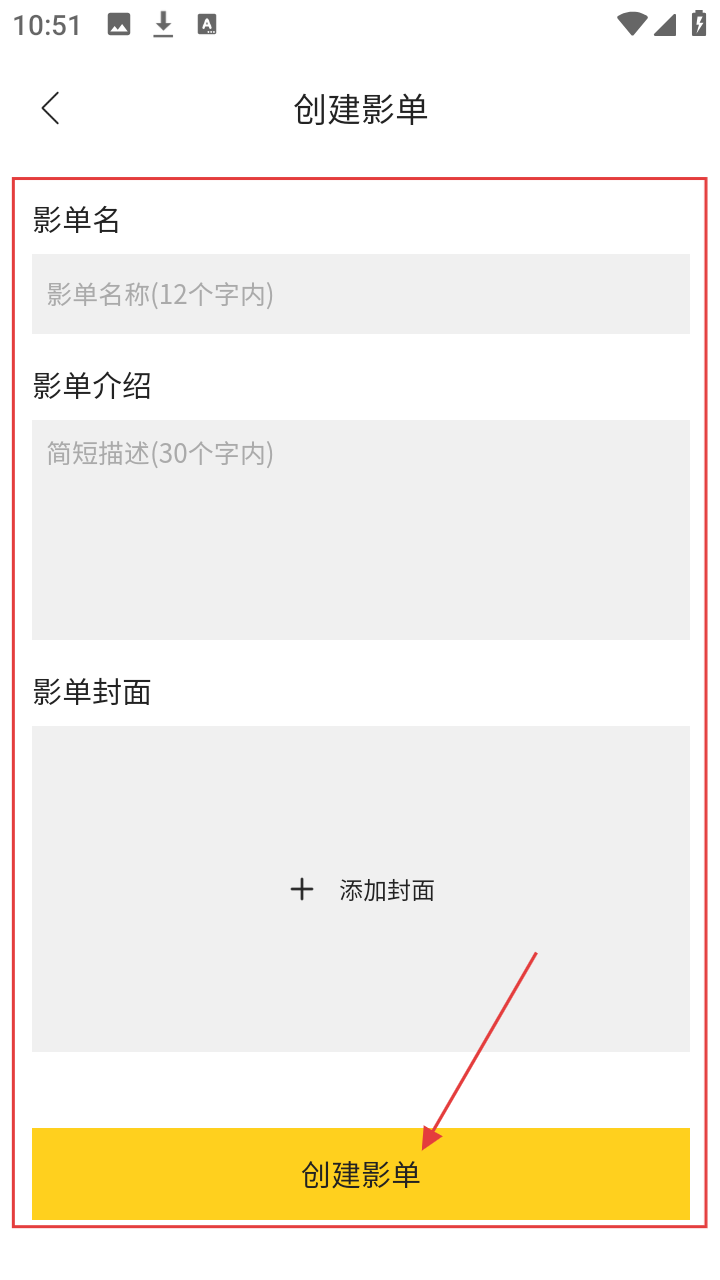 2、在创建影单界面填写影单名、影单介绍,添加封面后,点击【创建影单】,完成影单创建啦。