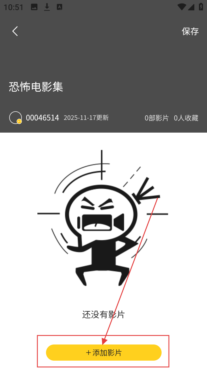 3、影单创建后,点击【+添加影片】,进入影片查找界面,开始往影单里加影片哦。