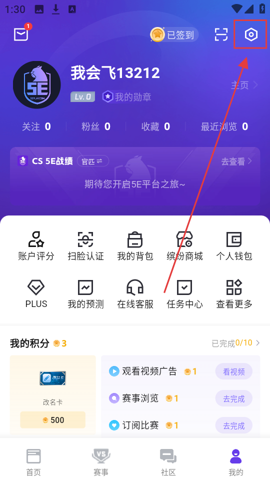 1、打开5E平台个人中心页面,点击右上角设置按钮,进入设置页面,准备进行Steam账号绑定操作啦。