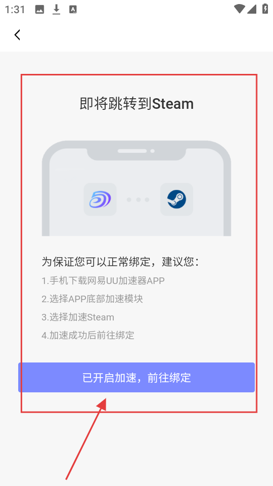 4、若已开启加速,点击【已开启加速,前往绑定】按钮,即可跳转至Steam,进行账号绑定,完成操作啦。