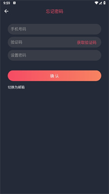 4、如果忘记密码的话,可以在忘记密码界面输入手机号、验证码和新密码,邮箱注册的用户可以切换为邮箱。