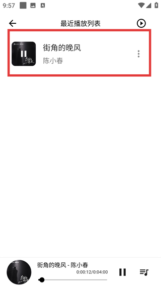 4、进入【最近播放列表】页后,能看到刚听过的歌曲条目,点它就能继续播放对应的音乐啦。