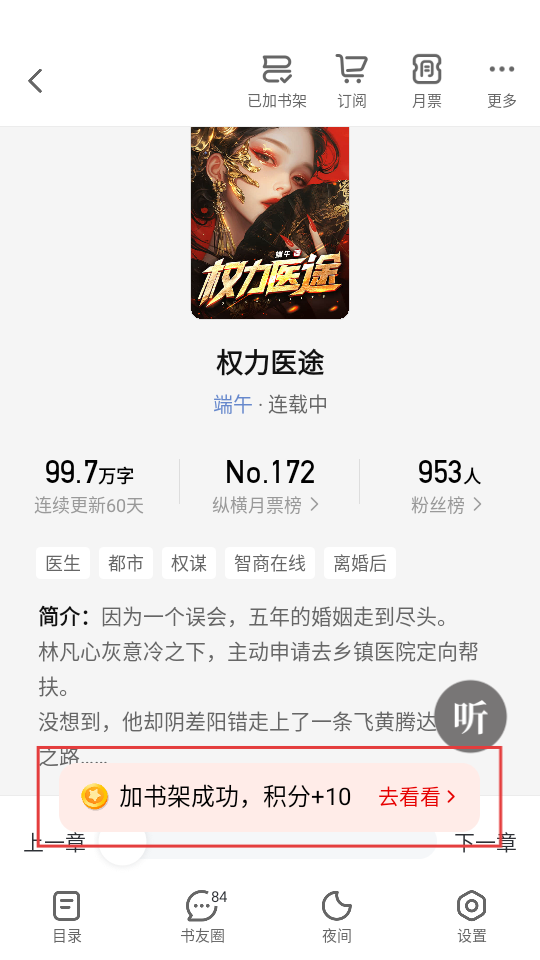 3、点击后,会提示“加书架成功,积分+10”,说明书籍已成功加入书架,这样之后找书就方便啦。
