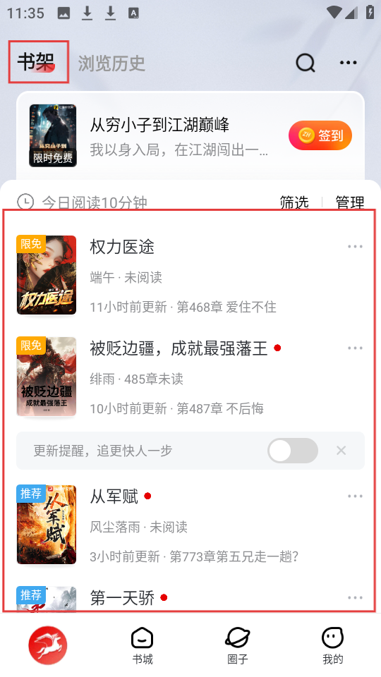 1、我们进入软件书城页面,能看到“今日爆更”里的各类书籍,若对某本书感兴趣,点击书籍标题,即可进入详情页啦。