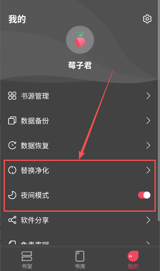 4、在“我的”页面里,可以管理书源、备份数据、设置净化规则和夜间模式,让阅读更舒心。