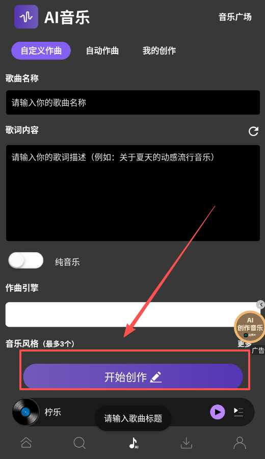 2、接着为你的歌曲命名,并在歌词内容栏描述主题,比如输入一段关于毕业季的青春故事,再勾选纯音乐选项来启动作曲引擎。