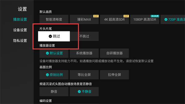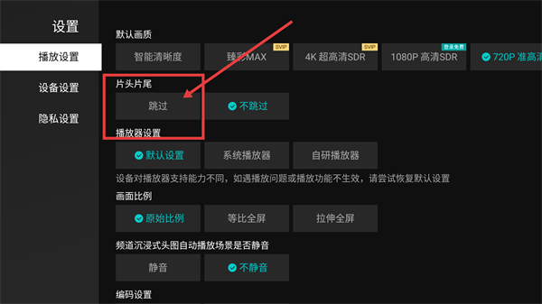 3、在设置页的【播放设置】里,找到【片头片尾】选项,可选择是否跳过片头等内容啦。