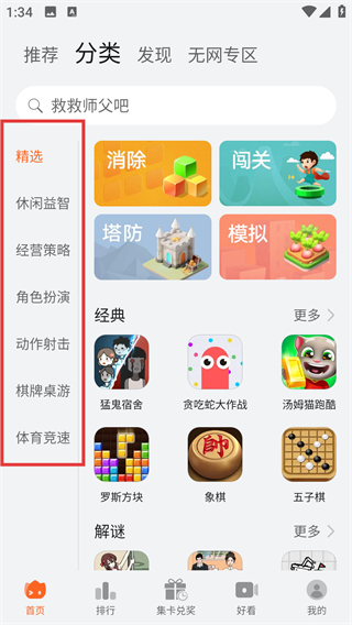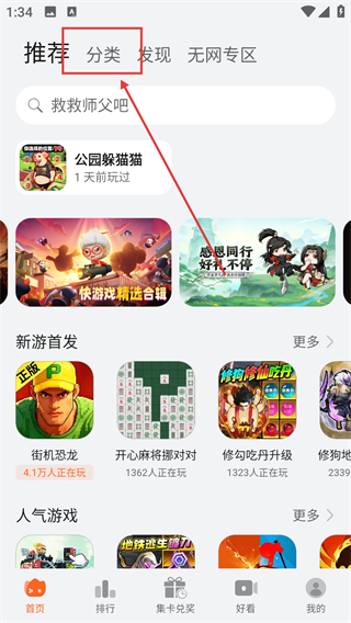 1、在软件的首页,点击顶部的【分类】标签,可进入游戏分类页面,按需挑选不同类型的游戏啦。