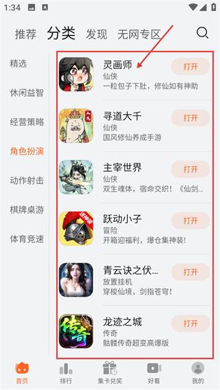 3、在角色扮演类游戏列表里,找到心仪的游戏(如灵画师),点击右侧的【打开】按钮,就能启动该游戏啦。