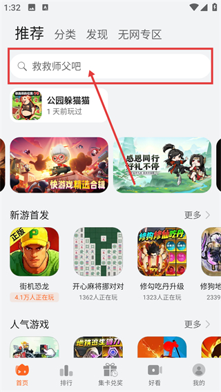 1、在推荐页点顶部搜索框,能进入搜索界面,后续可输入想找的游戏名称来查找啦。