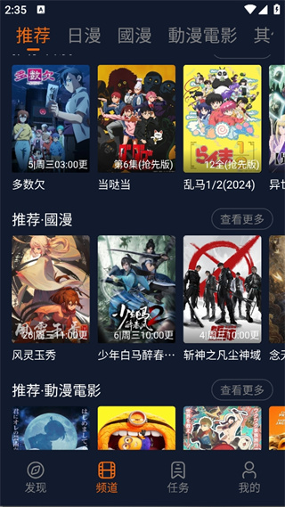 1、打开软件后首先看到顶部导航栏有推荐、新番、日漫、国漫等分类标签,点击任意标签即可进入相应内容区,新手可以从推荐页开始浏览。