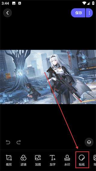2、进入图片编辑页后,点击底部的【贴纸】按钮,就能打开贴纸选择界面,给图片添加装饰元素哦。