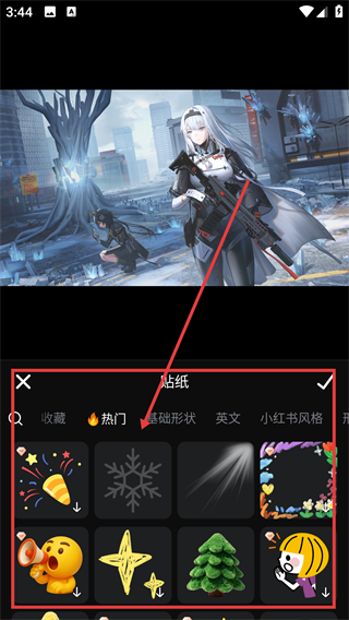 3、在贴纸界面选择喜欢的贴纸样式,比如热门分类下的装饰贴纸,点击就能将其添加到图片上啦。