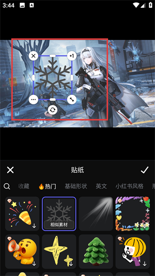 4、添加贴纸后可调整其位置和大小,确认效果后点击右上角的对勾,就能完成贴纸的添加操作啦。