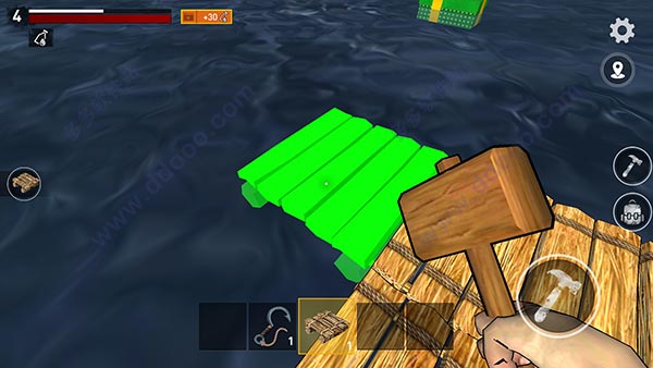 4、我们制造完了这个茅草基座,在背包里把茅草基座拖入快捷栏,然后回到主界面点击快捷栏里的茅草基座。人物会举个锤子出来,我们把准心对着原来小船边缘的海面,会出现茅草基座的影子,当基座变成绿色点击右下角的建造图标,就能把基座组装到船上了。其他物品的组装方法也一样,是不是很简单的呢?(物品拖入快捷栏使用)