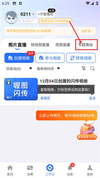 1、登录个人账号,点击主页面最下方的【工作台】版块,点击【直播相册】;