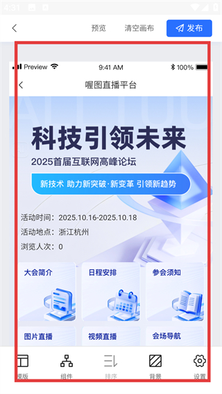 4、进入专题编辑页后,可通过底部的【模版】【组件】等功能调整内容,编辑完成后就能发布专题啦。