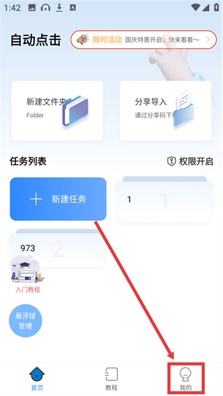 1、在【自动点击】主界面点击底部【我的】选项,就能进入个人中心页面,查看各类功能入口啦。