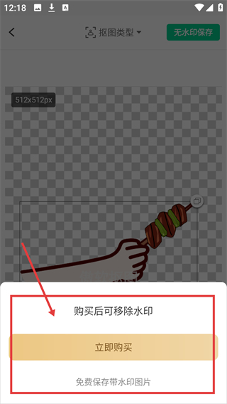 3、弹出保存选项后,可选择【立即购买】解锁无水印保存,或选【免费保存带水印图片】获取素材呀。