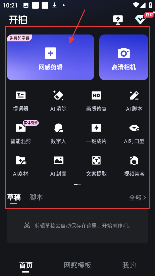 1、点击【网感剪辑】,进入剪辑界面,可开始创作网感视频哦。