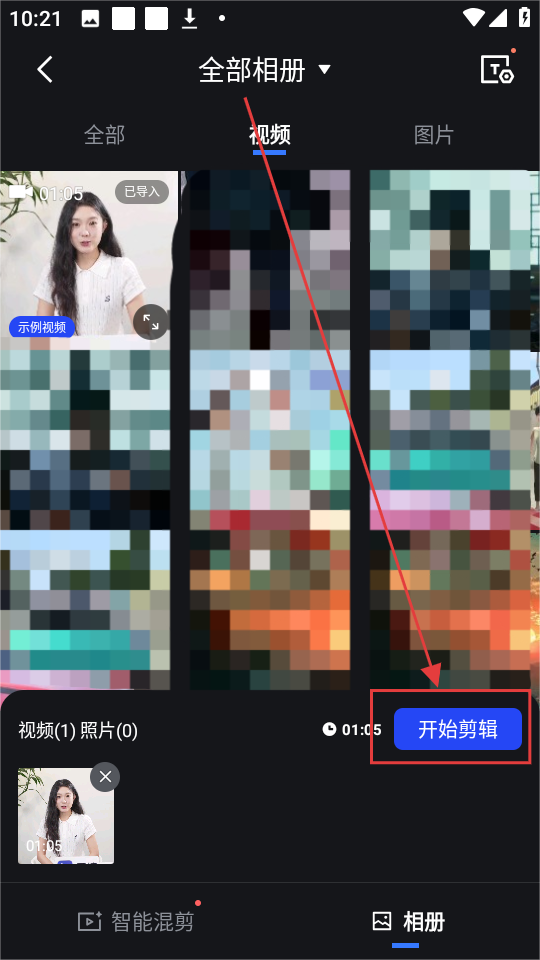 2、在相册中选择要剪辑的视频,点击【开始剪辑】,即可进入视频编辑界面啦。