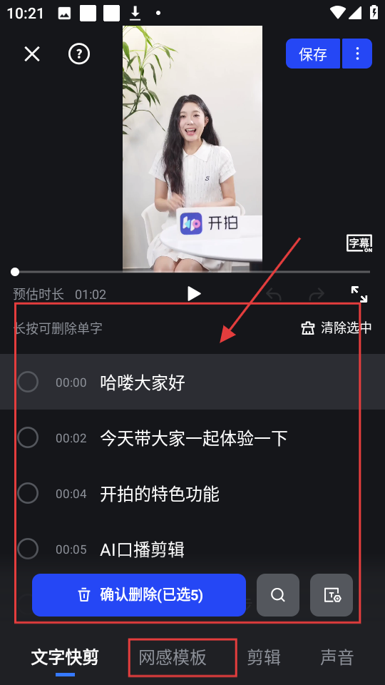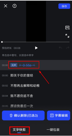 3、【文字快剪】可智能别视频:语气词,无声片段,重复片段;选中即可一键删除,快速提高剪辑效率;