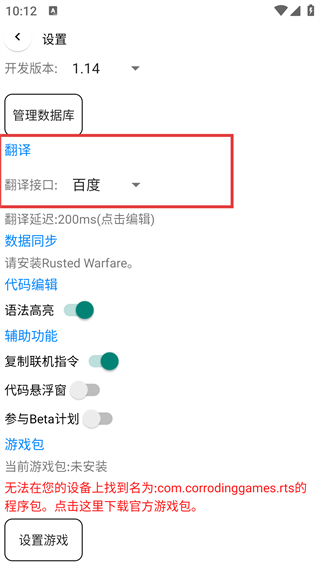 3、在【铁锈助手】设置界面,到【翻译】模块,查看当前【翻译接口-百度】配置状态。